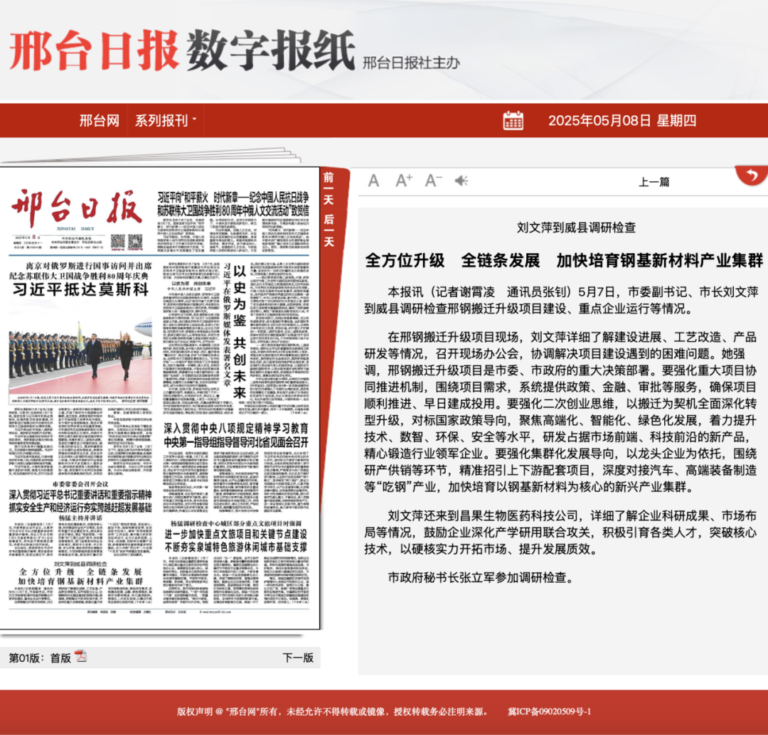 本報(bào)訊(記者謝霄凌 通訊員張釗)5月7日,市委副書記、市長劉文萍到威縣調(diào)研檢查邢鋼搬遷升級(jí)項(xiàng)目建設(shè)、重點(diǎn)企業(yè)運(yùn)行等情況。