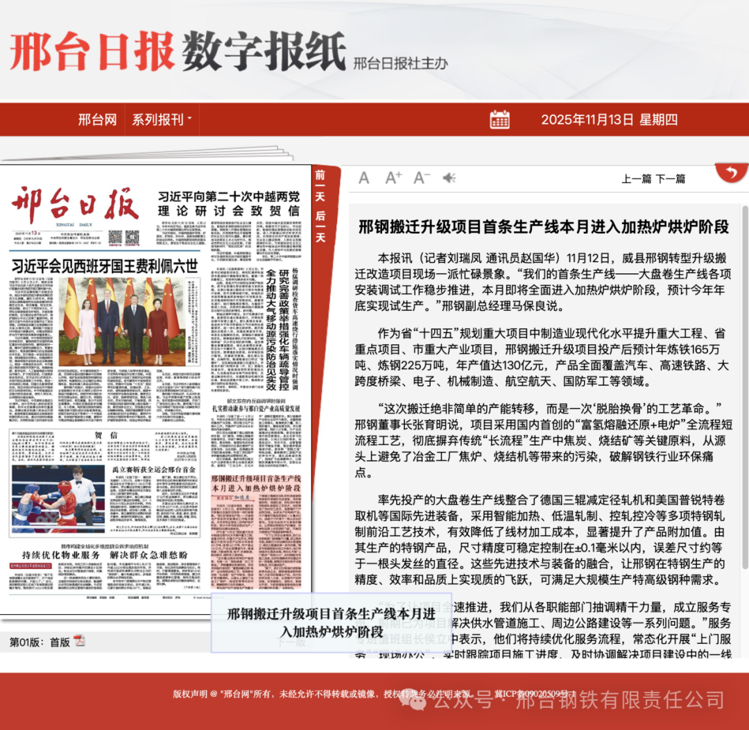 率先投產(chǎn)的大盤卷生產(chǎn)線整合了德國三輥減定徑軋機(jī)和美國普銳特卷取機(jī)等國際先進(jìn)裝備,采用智能加熱、低溫軋制、控軋控冷等多項(xiàng)特鋼軋制前沿工藝技術(shù),有效降低了線材加工成本,顯著提升了產(chǎn)品附加值。由其生產(chǎn)的特鋼產(chǎn)品,尺寸精度可穩(wěn)定控制在±0.1毫米以內(nèi),誤差尺寸約等于一根頭發(fā)絲的直徑。這些先進(jìn)技術(shù)與裝備的融合,讓邢鋼在特鋼生產(chǎn)的精度、效率和品質(zhì)上實(shí)現(xiàn)質(zhì)的飛躍,可滿足大規(guī)模生產(chǎn)特高級(jí)鋼種需求。“為了讓項(xiàng)目全速推進(jìn),我們從各職能部門抽調(diào)精干力量,成立服務(wù)專班,前期已為項(xiàng)目解決供水管道施工、周邊公路建設(shè)等一系列問題。”服務(wù)專班值班組長侯立中表示,他們將持續(xù)優(yōu)化服務(wù)流程,常態(tài)化開展“上門服務(wù)”“現(xiàn)場辦公”,實(shí)時(shí)跟蹤項(xiàng)目施工進(jìn)度,及時(shí)協(xié)調(diào)解決項(xiàng)目建設(shè)中的一線難題,保障項(xiàng)目按時(shí)間節(jié)點(diǎn)高效推進(jìn),早日建成投產(chǎn)。“眼下,我們正對(duì)標(biāo)國內(nèi)首鋼智新等先進(jìn)企業(yè),瞄準(zhǔn)高強(qiáng)度耐熱鋼等八大系列的高精尖產(chǎn)品,加大科技研發(fā)投入力度,全面提升產(chǎn)品附加值,實(shí)現(xiàn)高端化、綠色化、智能化升級(jí),為我國高端裝備制造業(yè)提供關(guān)鍵材料支撐。”馬保良說。