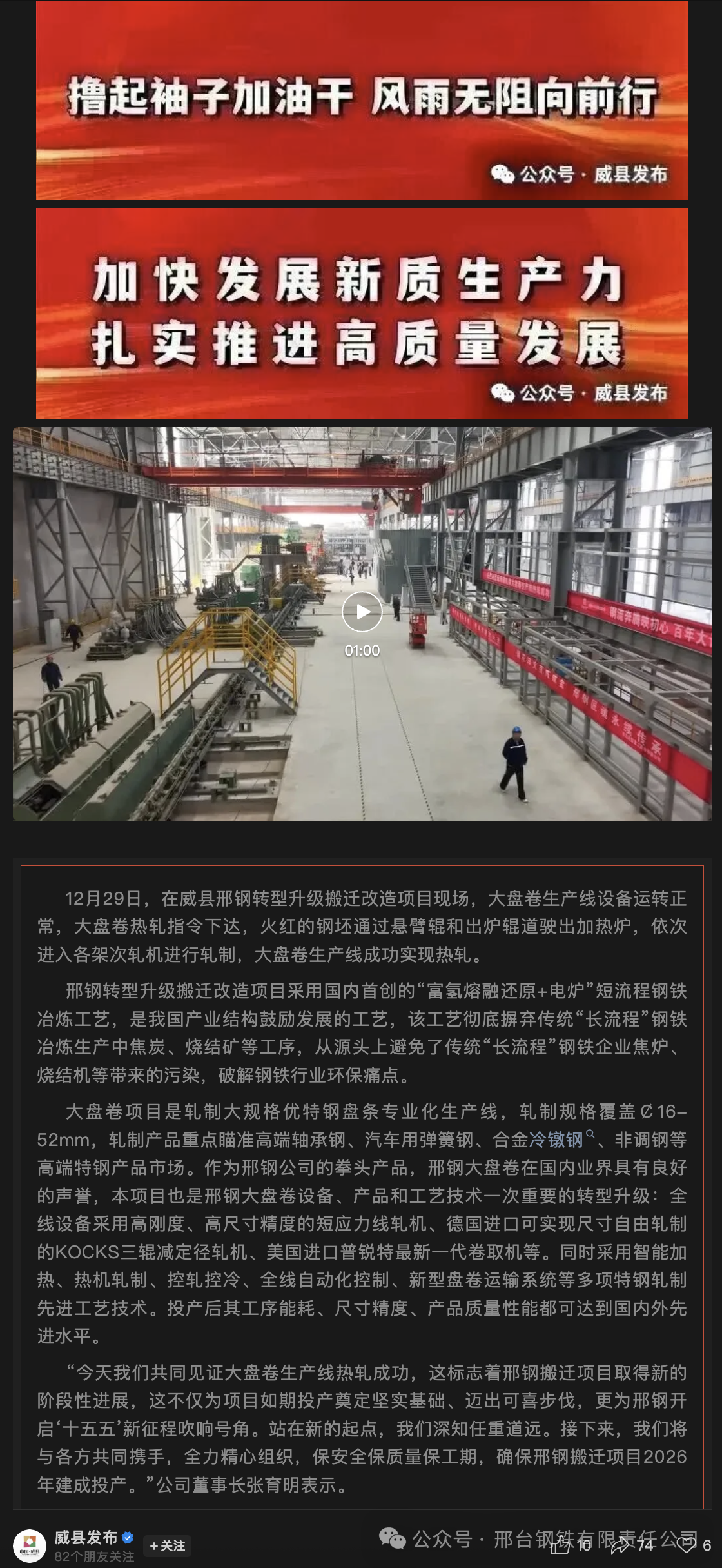“今天我們共同見證大盤卷生產(chǎn)線熱軋成功,這標(biāo)志著邢鋼搬遷項(xiàng)目取得新的階段性進(jìn)展,這不僅為項(xiàng)目如期投產(chǎn)奠定堅(jiān)實(shí)基礎(chǔ)、邁出可喜步伐,更為邢鋼開啟‘十五五’新征程吹響號(hào)角。站在新的起點(diǎn),我們深知任重道遠(yuǎn)。接下來,我們將與各方共同攜手,全力精心組織,保安全保質(zhì)量保工期,確保邢鋼搬遷項(xiàng)目2026年建成投產(chǎn)。”公司董事長(zhǎng)張育明表示。